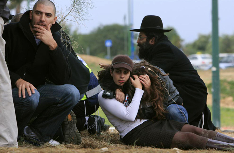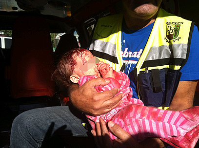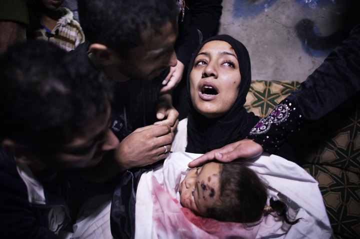 תינוקת שנפגעה בקרית מלאכי מפגיעה ישירה של טיל שירה החמאס. צילום: גדעון רחמיםאבא נושא תינוקת שנהרגה מהתקפת חיל האוויר הישראלי. תצלום: מרקו לונגרי, איי.אף.פי גטי אימג'ספצועים בעזה. מקור: http://www.allworldwars.com"נפגעי חרדה", קרית מלאכי. תצלום: ניר אליאס, רויטרס