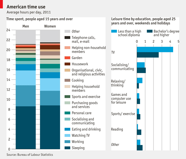 כך למשל חקר התמורות בתרבות הפנאי בישראל שערך מכון גוטמן למחקר חברתי שימושי מוכיח סתירה שכולנו מכירים: ככל שמתפנה לנו יותר פנאי, אנו חיים בתחושה גוברת שאין לנו זמן פנוי. ומה אנו עושים עם הזמן היקר הזה? ב-2011, למשל, מתוך כ-7 שעות פנאי (לא כולל שינה), האמריקאי הממוצע חשב או נח כחצי שעה ביום בלבד (!). לעומת זאת הוא צפה בטלוויזיה 4.5 שעות – יותר ממחצית הזמן הפנוי שלו בכל יום ויום – ודיבר עם חברים שעה (ראו גרף מצורף).